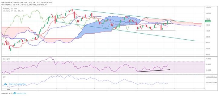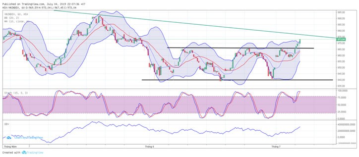 Kết phiên giao dịch ngày 4/7/2019, VN-Index chốt ở 973,04 điểm, tăng 12,65 điểm (+1,32%) với khối lượng giao dịch khớp lệnh đạt 135 triệu đơn vị, giá trị 3.020 tỷ đồng.