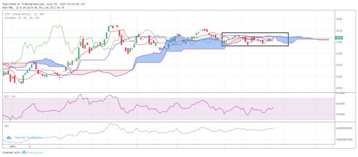 Nếu ở chart Daily, VRE đang có một vài chỉ báo chính ủng hộ như Stochastic, hay OBV, thì với ichimoku, giá cũng đang nằm trên cả Tenkan và Kijun- Sen. Tuy vẫn ở dưới đám mây cực mỏng nhưng SpanA đang nằm trên SpanB, điều này gợi ý giá có thể xuyên thủng đám mây nhanh chóng trong những phiên tới.
