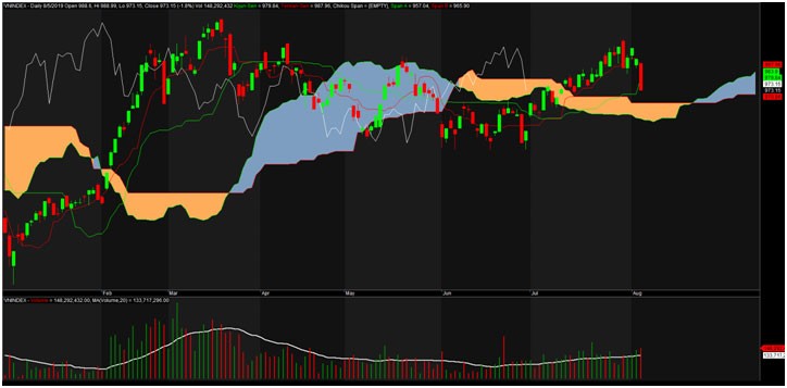 Với hệ thống ichimoku, giá nằm dưới cả Tenkan và Kijun chỉ trong 1 ngày giao dịch, mặc dù khoảng cách giữa 2 đường này là khá xa cho thấy phiên giảm điểm 5/8 là quá mạnh. Đường Tenkan đang có xu hướng cắt đường Kijun xuông dưới đang là tín hiệu rất xấu. Chỉ hy vọng khu vực đám mây được án ngữ bởi Span B (965) và Span A (957) sẽ chặn được đà rơi của VN-Index.