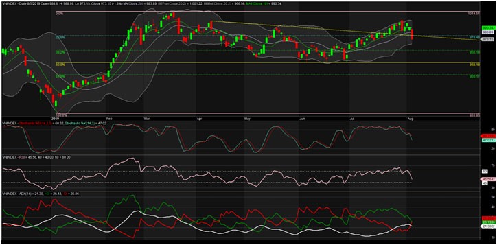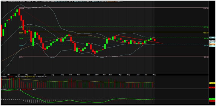 Kết phiên giao dịch ngày 5/8/2019, VN-Index chốt ở 973,15 điểm, giảm 17,95 điểm (-1,81%) với khối lượng giao dịch khớp lệnh đạt 148 triệu đơn vị, giá trị 3.370 tỷ đồng.