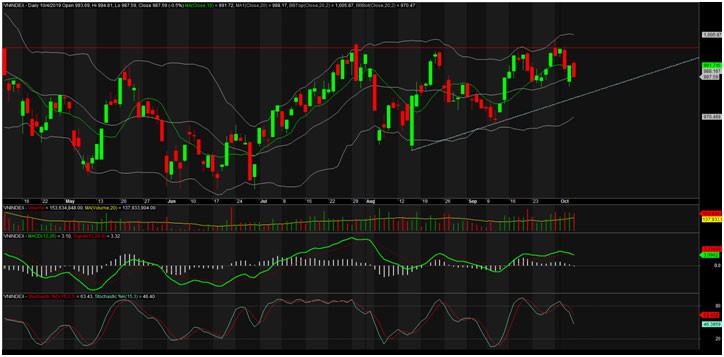 Kết phiên giao dịch ngày 4/10/2019, VN-Index chốt ở 987,59 điểm, giảm 4,86 điểm (-0,49%) với khối lượng giao dịch khớp lệnh đạt 154 triệu đơn vị, giá trị 3.262 tỷ đồng.