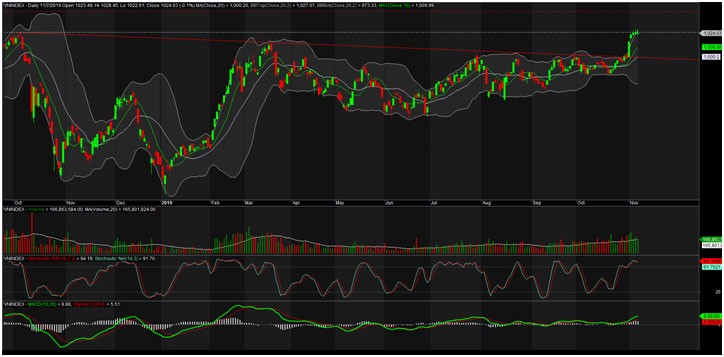 Kết phiên giao dịch ngày 7/11/2019, VN-Index chốt ở 1.024,03 điểm, giảm 0,88 điểm (-0,09%) với khối lượng giao dịch khớp lệnh đạt 167triệu đơn vị, giá trị 3.400 tỷ đồng.