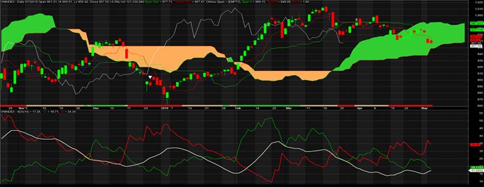 Chỉ báo Ichimoku: Trên chart daily VN-Index đã đi sâu vào vùng mây, mặc dù SpanA và SpanB cách nhau khá xa (vùng mây dày). Theo lý thuyết, mây càng dày thì hỗ trợ càng mạnh, nhưng nhìn đồ thị thì có vẻ giá sắp xuyên thủng mây.