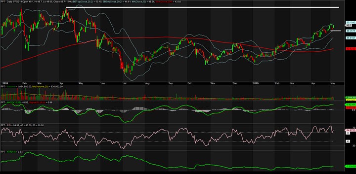 Nếu quan sát chuỗi tăng của FPT tính từ 4/3/2019, thì mã này mới tăng khoảng 7%, chưa nhiều cũng không ít, Ngược lại chuỗi tăng khá chắc chắn, người chốt cứ chốt, người mua vẫn mua. Khối lượng giao dịch tốt ở những phiên tăng giá, còn những phiên điều chỉnh thì khối lượng giao dịch rất thấp, ngoại trừ phiên 6/5. Trong suốt giai đoạn, giá hồi phục nhanh và thuyết phục.