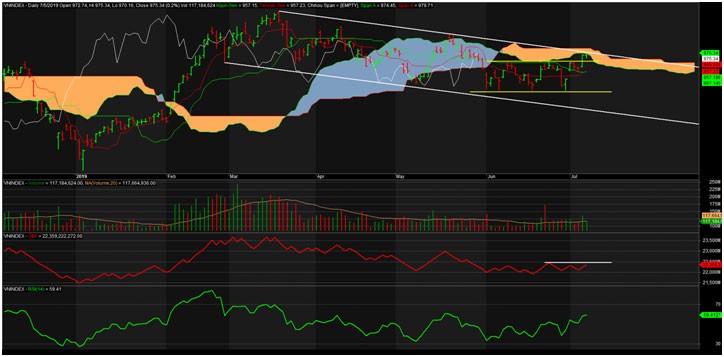 Quan sát chỉ số với hệ thống Ichimoku cho thấy giá đã xuyên thủng SpanA và đang hướng tới SpanB (980 điểm), đường Tenkan-Sen cũng đã chớm vượt Kijun-Sen cho dấu hiệu tích cực. Nếu xét trong bối cảnh hiện tại, tâm lý đang lên, dòng dẫn dắt đã lộ diện thì khoảng cách 5 điểm để vượt lên đám mây là hoàn toàn có thể đạt được