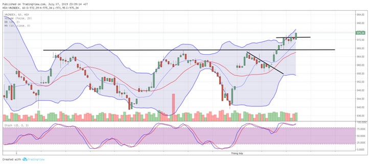 Kết phiên giao dịch ngày 5/7/2019, VN-Index chốt ở 975,34 điểm, tăng 2,3 điểm (+0,24%) với khối lượng giao dịch khớp lệnh đạt 117 triệu đơn vị, giá trị 2.712 tỷ đồng.
