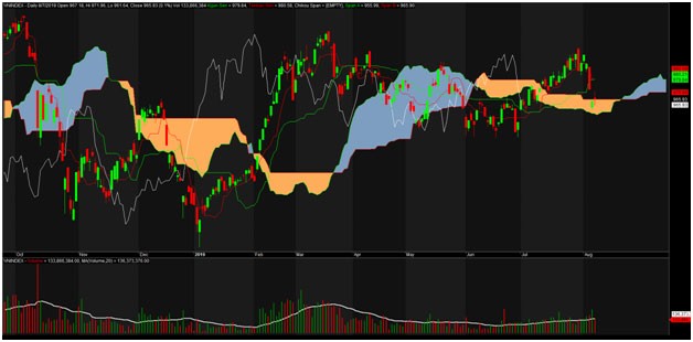 Với hệ thống Ichimoku, giá đang nằm trên SpanB cho hy vọng, đám mây với 2 ngưỡng SpanB (965.90) và SpanA (955,99) sẽ là khu vực hỗ trợ mạnh giúp chỉ số đứng vững ở khu vực này. Trong khi đó, đường Tenkan đã gập xuống, tuy chưa cắt qua Kijun nhưng đã áp sát rất gần. Các tín hiệu khác từ hệ thống cũng không mấy tích cực, từ đường Chikou Span đang có chiều hướng cắt xuống đường giá đến đường SpanA cũng đang có xu hướng cắt đường SpanB.