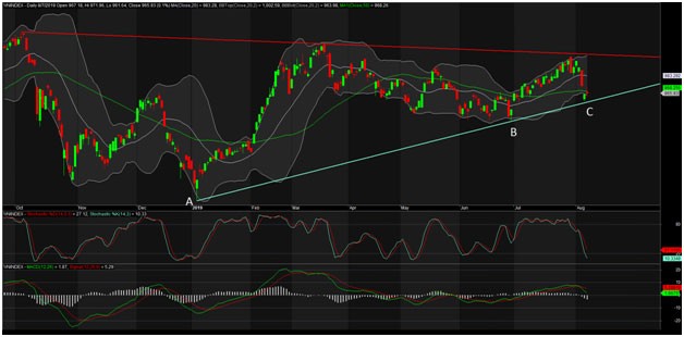 Trên đồ thị, VN-Index vẫn chưa vượt nổi đường MA50 (968) mặc dù đã rất nỗ lực. Dường như chỉ số đang muốn lấp lại GAPDOWN được tạo ra từ phiên hôm trước (6/8) rồi lại tiếp tục dịch chuyển theo xu hướng xuống, vì hiện tại, rõ ràng nhiều chỉ báo khác cũng khá tiêu cực. Tuy nhiên, kênh lên (như hình vẽ) vẫn chưa sai, thì vẫn có cơ sở tin rằng đáy có lẽ chỉ loanh quanh đâu đây tầm (957-960).