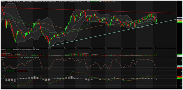 Với hệ thống Ichimoku, vùng mây giới hạn bởi Span B(955) và Span A(965) đang làm nhiệm vụ hỗ trợ rất tốt khi hiện tại vẫn ngăn được VN-Index xuyên qua. Phiên cuối tuần ngày 9/8, khu vực 980 điểm là nơi án ngữ của cả bộ đôi Tenkan và Kijun hứa hẹn sẽ là khu vực tranh chấp quyết liệt của cả bên mua và bên bán. Chưa biết bên nào sẽ thua, nhưng nếu bên mua thắng thì có cơ sở tin rằng VN-Index chính thức quay lại xu hướng tăng trước đó.