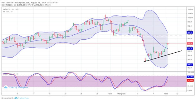 Kết phiên giao dịch ngày 8/8/2019, VN-Index chốt ở 975,24 điểm, tăng 9,31 điểm (+0,96%) với khối lượng giao dịch khớp lệnh đạt 158 triệu đơn vị, giá trị 3.451 tỷ đồng.