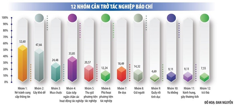 Cụ thể, Luật Báo chí (năm 2016) quy định các hành vi bị nghiêm cấm, bao gồm đe dọa, uy hiếp tính mạng, xúc phạm danh dự, nhân phẩm của nhà báo, phóng viên; phá hủy, thu giữ phương tiện, tài liệu, cản trở nhà báo, phóng viên hoạt động nghề nghiệp đúng pháp luật...