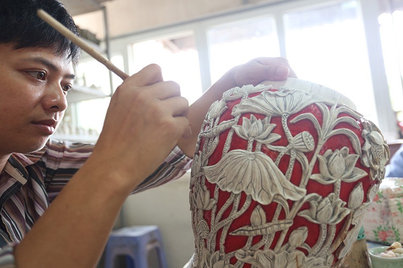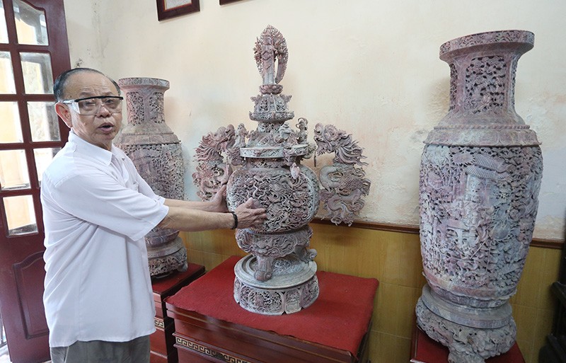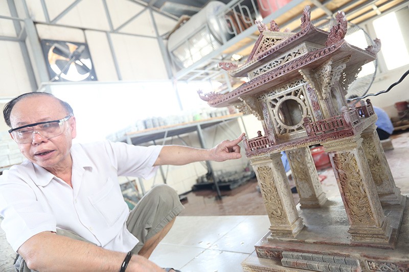 Ông Minh bên cạnh tác phẩm Khuê Văn Các đang trong giai đoạn hoàn thiện và đã được khách hàng đặt mua với giá hơn 60 triệu đồng