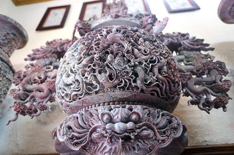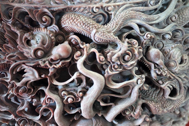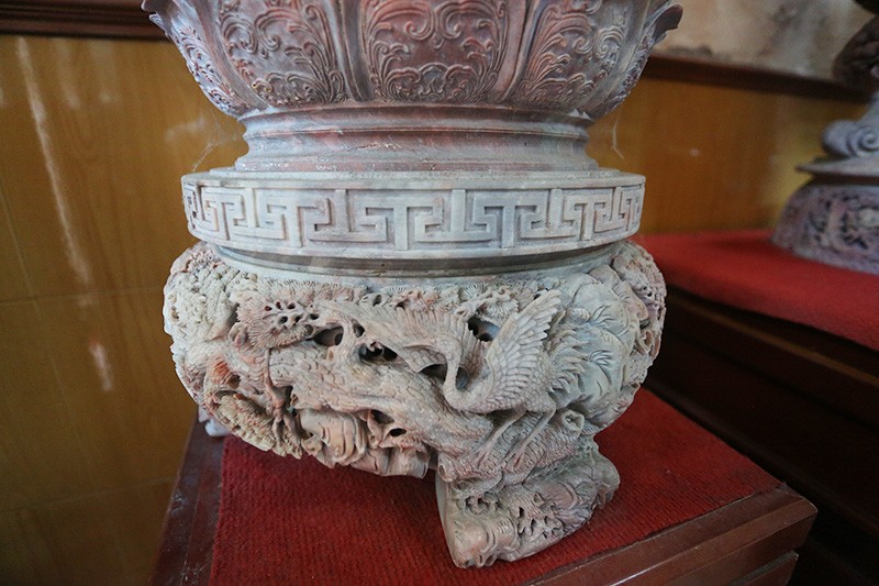 Lư Hương được chạm khắc bối cảnh "lưỡng long tranh châu" đường kính 45cm với ý nghĩa để trùng với năm Cách mạng Tháng Tám thành công