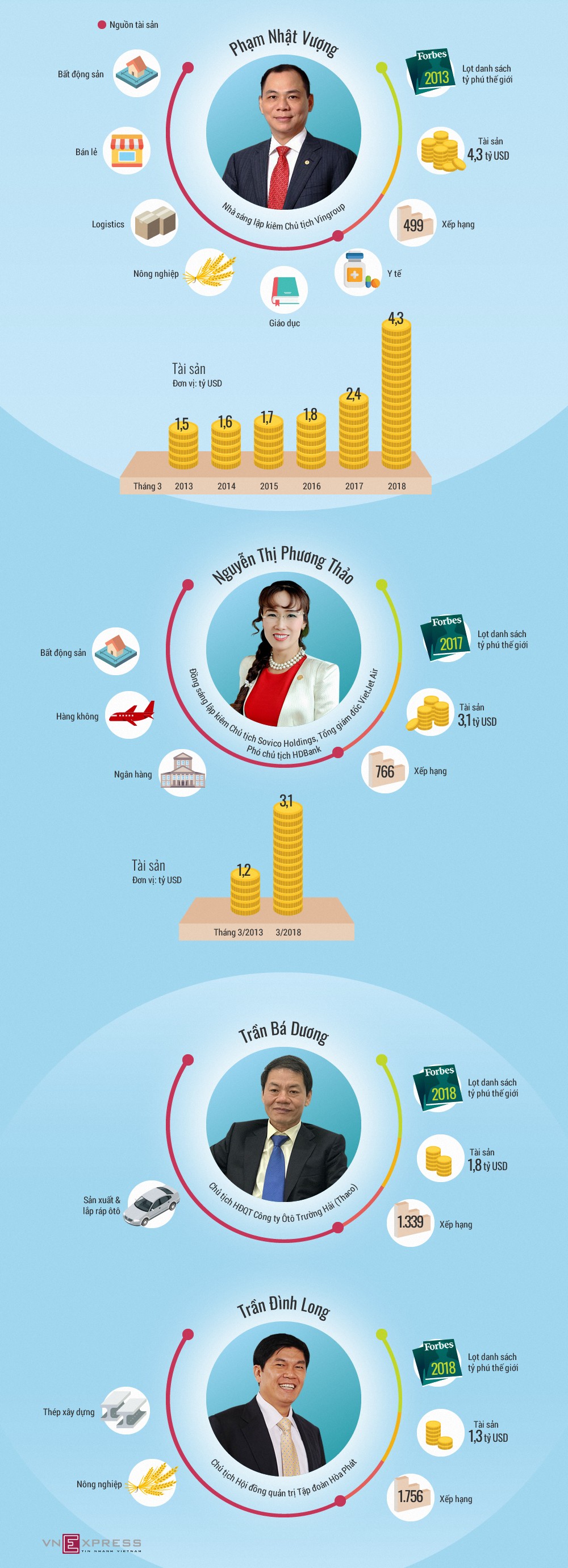 Theo Vnexpress Tin liên quan Người giàu nhất hành tinh kiếm gần 40 tỷ USD một năm 07/03/2018 07:23 5 cách làm giàu 'dễ như dạo chơi' của các tỷ phú 07/03/2018 07:21 Forbes: Việt Nam có thêm 2 tỷ phú 07/03/2018 07:01 Nữ tỷ phú 21 tuổi trẻ nhất thế giới 07/03/2018 07:08 Từ khóa tỷ phú usd tỷ phú usd việt nam Phạm Nhật Vượng Nguyễn Thị Phương Thảo Trần Bá Dương Trần Đình Long Forbes