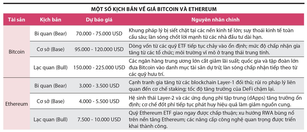 Dù vậy, sự chú ý chủ đạo và dòng vốn lớn nhất vẫn tập trung vào hai tài sản dẫn đầu là Bitcoin và Ethereum. Để cung cấp một cái nhìn tổng quan và sâu hơn về các kịch bản tiềm năng của hai tài sản chủ chốt này, bảng tổng hợp dưới đây trình bày các dự báo giá cùng những nguyên nhân chính có thể dẫn đến từng kịch bản tương ứng.