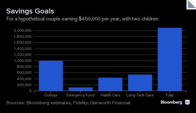 Do đó, một cặp vợ chồng thu nhập cao ở thành phố New York cần phải dành dụm cho những khoản chi tiêu đó sau khi đã thanh toán 39,6% mức thuế suất liên bang cho khoản thu nhập trên 450.000 USD và 12,7% mức thuế địa phương. Ngoài ra, họ nên tiết kiệm 15% thu nhập cho những chi tiêu sau khi đã về hưu.
