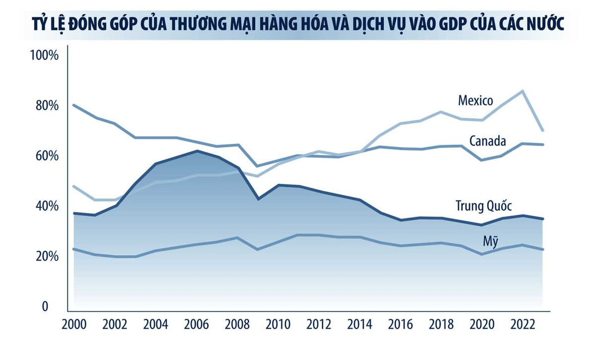 Thuế quan của Mỹ được cho là sẽ ảnh hưởng nặng nề hơn đến Canada và Mexico, vì thương mại chiếm khoảng 70% GDP của cả 2 nền kinh tế này.