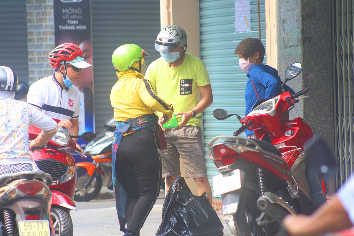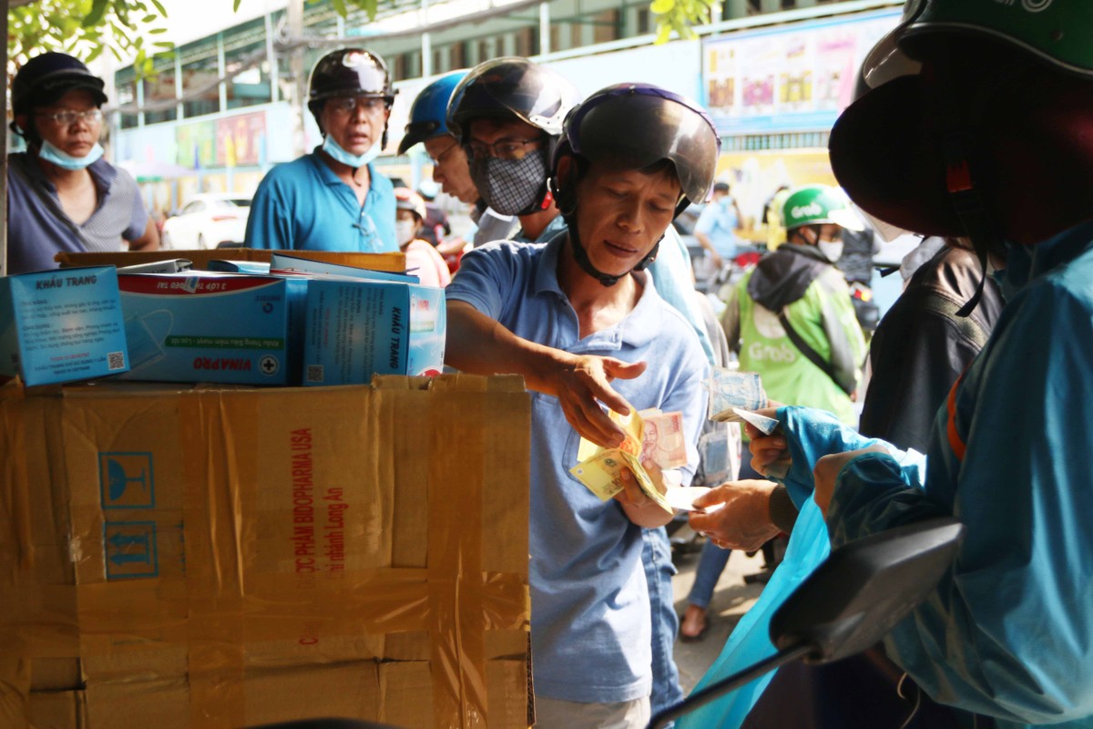 Trên vỉa hè quận 10, khách đi đường tấp vào mua khẩu trang khá nhiều.Mở thùng nào là hết ngay.