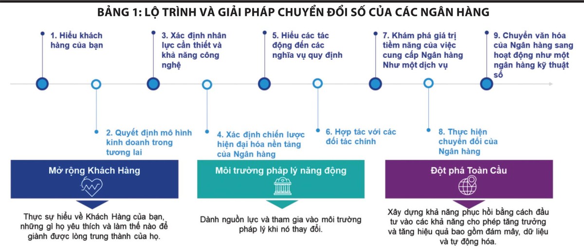Chuyển đổi số gắn kết với tư duy hiện đại, không ngại đổi mới: Các ngân hàng hàng đầu đang phát triển hướng tiếp cận một cách hợp tác hơn để giúp thúc đẩy sự thay đổi. Điều này bao gồm việc khuyến khích sự tham gia của nhiều đơn vị kinh doanh và kết nối nhiều người với nhau hơn để chia sẻ và giới thiệu các ý tưởng mới, thực hiện các quy trình mới và giúp tháo gỡ các khúc mắc trong hoạt động hiện có, đồng thời tạo ra một bầu không khí khuyến khích văn hóa cho phép “thất bại thường xuyên, thất bại nhanh, học an toàn” (fail often, fail fast, learn safely). Khuyến khích thử nghiệm, xây dựng các phòng thí nghiệm sáng kiến và tạo môi trường văn hóa “Safe to fail”.