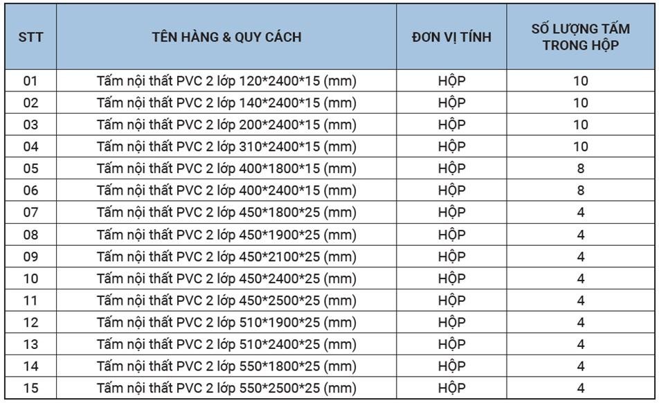 Kích thước cơ bản của tấm nội thất PVC – 2 lớp của Tập đoàn Nhựa Đông Á được dựa theo tiêu chuẩn phổ thông, với độ rộng đa dạng từ 120 mm cho tới 550 mm và độ dày của ván nhựa từ 15 mm đến 25 mm.