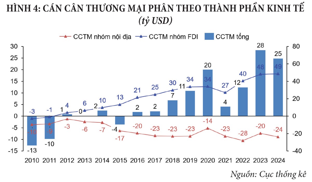 Trong giai đoạn 2016 - 2024, Việt Nam luôn có thặng dự thương mại, trong đó 3 năm gần nhất có thặng dư lớn (năm 2022 đạt 12 tỷ USD, năm 2023 đạt 28 tỷ USD, năm 2024 đạt 25 tỷ USD), giúp hỗ trợ ổn định tỷ giá, ổn định vĩ mô. Tuy nhiên, khi nhìn sâu hơn vào những con số này (Hình 4) thì thấy, thặng dư thương mại trên là nhờ khối doanh nghiệp FDI, trong khi cán cân thương mại của khối doanh nghiệp nội địa luôn thâm hụt và ngày càng sâu suốt 13 năm qua.