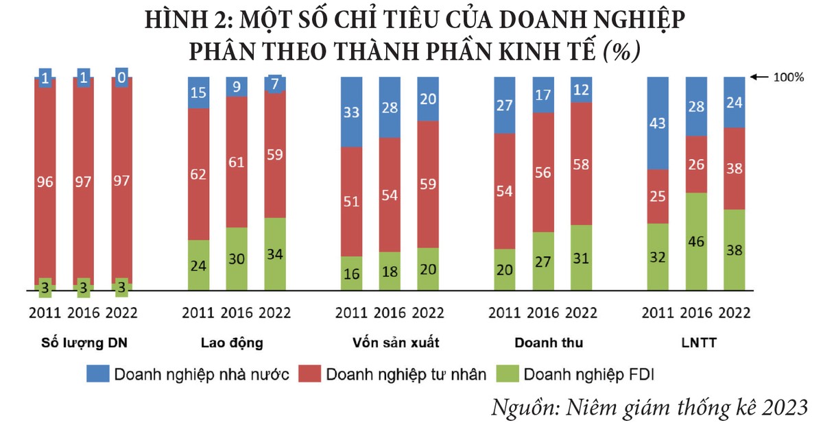 Cụ thể, theo số liệu của Cục Thống kê (Bộ Tài chính), năm 2011, khối KTTN sử dụng 62% lực lượng lao động và 51% vốn sản xuất, nhưng chỉ tạo ra 25% lợi nhuận. Năm 2022, các con số này lần lượt là 59%, 59% và 38% lợi nhuận. Trong khi đó, năm 2022, khối FDI chỉ sử dụng có 24% lực lượng lao động và 16% lượng vốn, nhưng tạo ra 38% lợi nhuận.