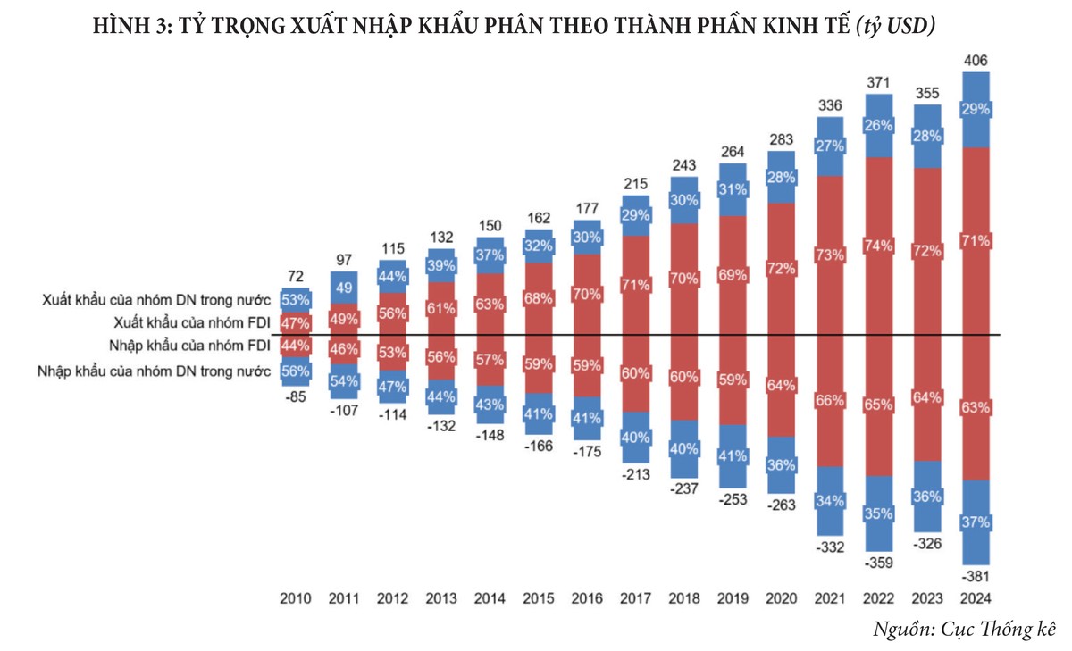 Nếu như năm 2010, khối doanh nghiệp trong nước chiếm 53% kim ngạch xuất khẩu và 56% kim ngạch nhập khẩu, thì đến năm 2024, khối doanh nghiệp trong nước chỉ còn chiếm 29% tổng kim ngạch nhập khẩu và 37% kim ngạch nhập khẩu. Ngược lại, trong cùng kỳ, khối FDI tăng thị phần kim ngạch xuất khẩu từ 47% lên 71% và nhập khẩu từ 44% lên 63% (Hình 3)