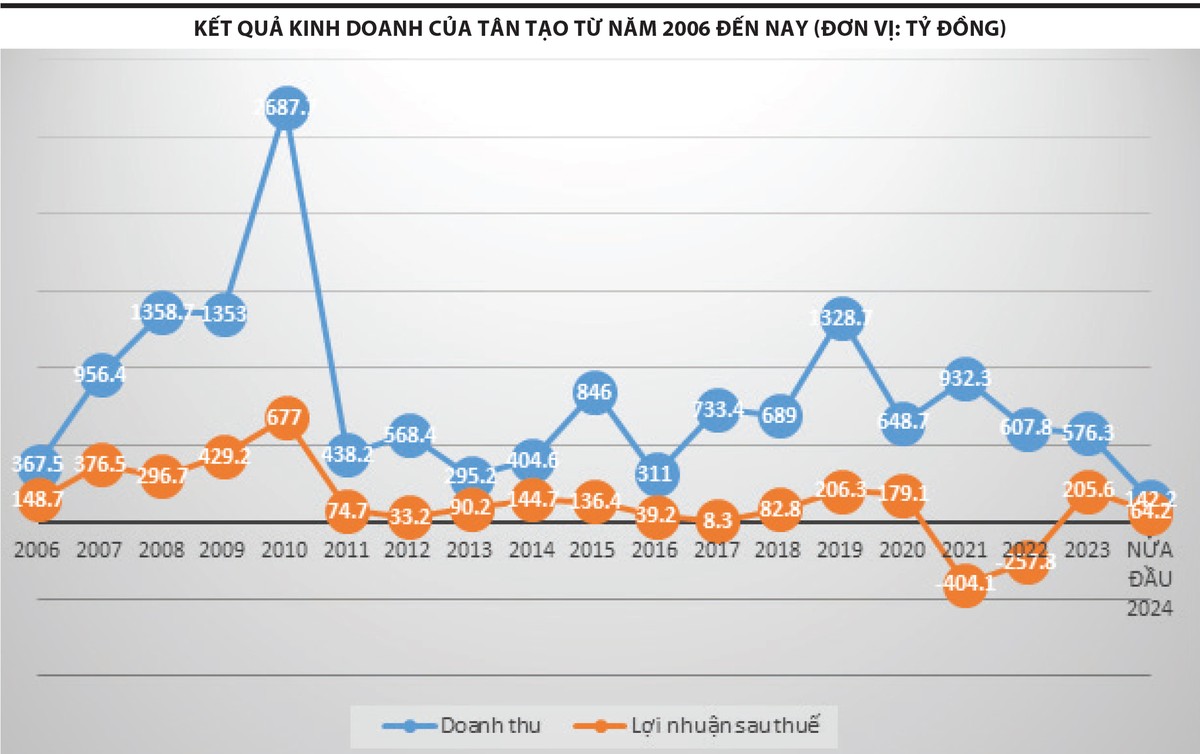 Năm 2023, Tân Tạo đạt 576,3 tỷ đồng doanh thu và 205,6 tỷ đồng lợi nhuận sau thuế; hai năm 2021 và 2022, doanh nghiệp lần lượt lỗ 404,1 tỷ đồng và lỗ 257,8 tỷ đồng.