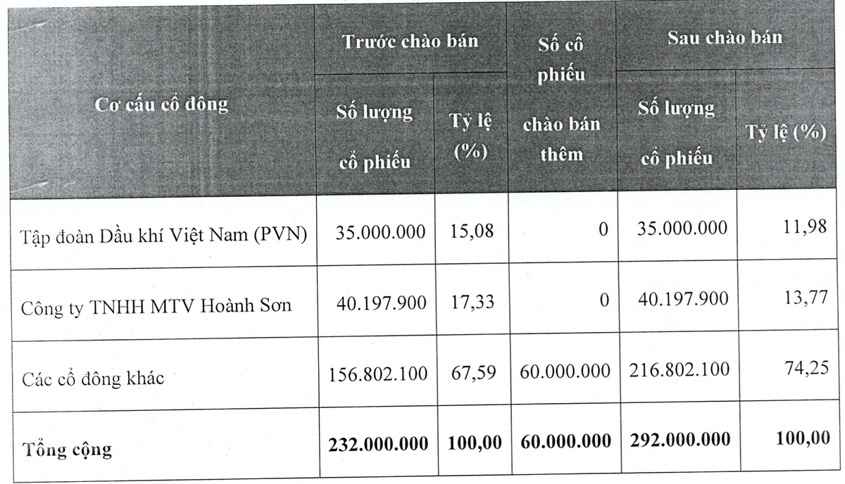 Hai cổ đông lớn của Cảng Phước An hiện tại là Tập đoàn Dầu khí Việt Nam (PVN) và Công ty TNHH MTV Hoành Sơn sẽ không tham gia đợt mua cổ phiếu này. Như vậy, tỷ lệ của 2 cổ đông lớn sẽ giảm xuống lần lượt 11,98% và 13,77% sau đợt chào bán.