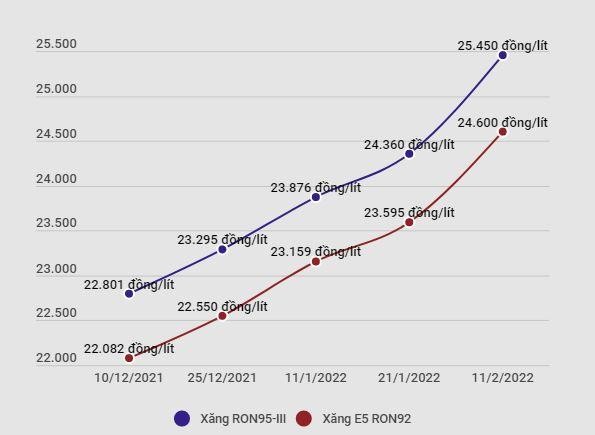 Trước đó, giá xăng đã tăng 3 lần liên tiếp. Lần gần nhất (ngày 21/1), mặt hàng xăng E5 RON92 tăng 436 đồng/lít; xăng RON95-III tăng 484 đồng/lít. Ngoài ra, dầu diesel 0.05S tăng 664 đồng/lít; dầu hỏa tăng 655 đồng/lít và dầu mazút 180CST 3.5S tăng 631 đồng/lít.