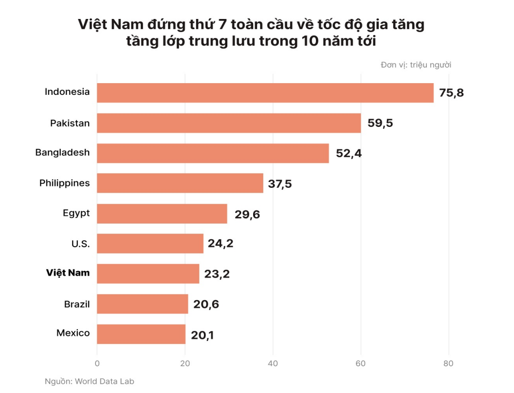 Đáng chú ý, tầng lớp trung lưu đang hình thành hiện chiếm 13% dân số và dự kiến sẽ lên đến 26% vào năm 2026. Theo báo cáo vào tháng 3/2021 của Statista, dự kiến đến năm 2030, dân số thuộc tầng lớp trung lưu tại Việt Nam sẽ đạt mức hơn 50 triệu người. Trong đó, tốc độ tăng trưởng hàng năm của tầng lớp trung lưu ở Việt Nam là 10,1% giai đoạn 2016 - 2021, mức cao nhất Đông Nam Á.