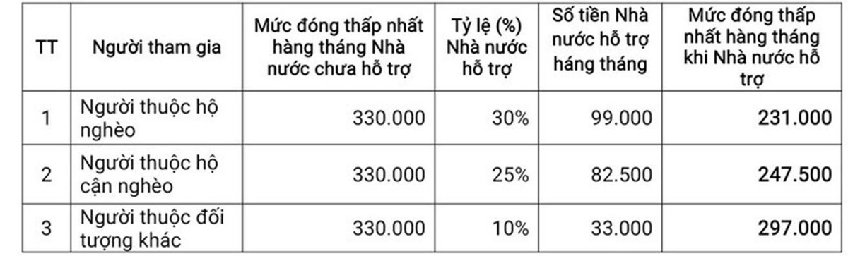 Đồng thời, mức hỗ trợ tiền đóng của Nhà nước đối với người tham gia BHXH tự nguyện cũng tăng lên. Theo đó, đối với người tham gia thuộc: hộ nghèo - số tiền hỗ trợ tăng từ 46.200 đồng lên 99.000 đồng/tháng (tăng 52.800 đồng); hộ cận nghèo - số tiền hỗ trợ tăng từ 38.500 đồng lên 82.500 đồng/tháng (tăng 44.000 đồng) và đối tượng khác - số tiền hỗ trợ tăng từ 15.400 đồng lên 33.000 đồng/tháng (tăng 17.600 đồng).