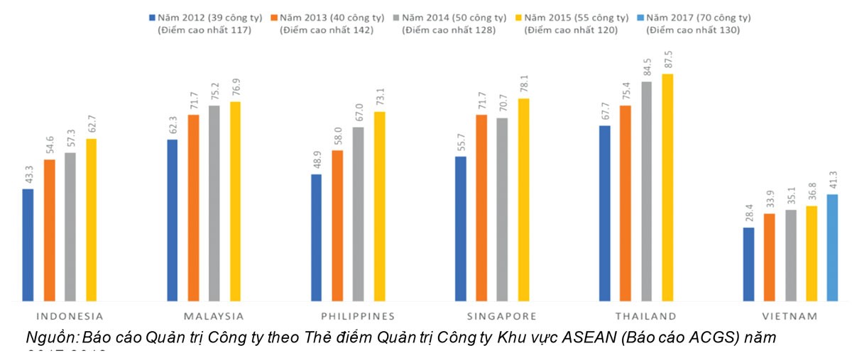 Theo ACGS, mặc dù có tiến bộ qua từng năm, nhưng điểm trung bình về quản trị công ty của Việt Nam vẫn còn một khoảng cách khá xa so với các nước trong khu vực, đặc biệt là Thái Lan và Singapore (xem biểu đồ).