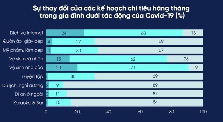 Những mặt hàng có mức chi tiêu tăng trưởng mạnh trong mùa dịch là các mặt hàng thiết yếu (đặc biệt là thực phẩm), dịch vụ Internet, nhà ở và tiện ích và chăm sóc sức khỏe.