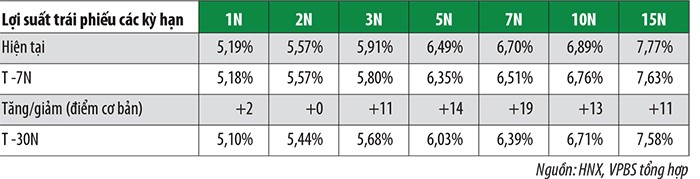 Lợi suất trái phiếu tiếp tục tăng tại các kỳ hạn, riêng lợi suất trái phiếu kỳ hạn 2 năm không thay đổi so với tuần trước đó.