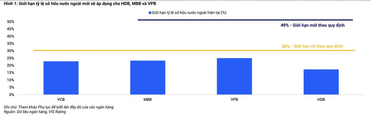 Theo VIS Rating, Nghị định mới chỉ áp dụng cho các ngân hàng thương mại cổ phần tư nhân, do đó, trong số bốn ngân hàng tham gia, bao gồm HDBank (HDB), MBBank (MBB), Vietcombank (VCB) và VPBank (VPB), giới hạn tỷ lệ sở hữu nước ngoài mới sẽ không áp dụng cho VCB - một ngân hàng quốc doanh .