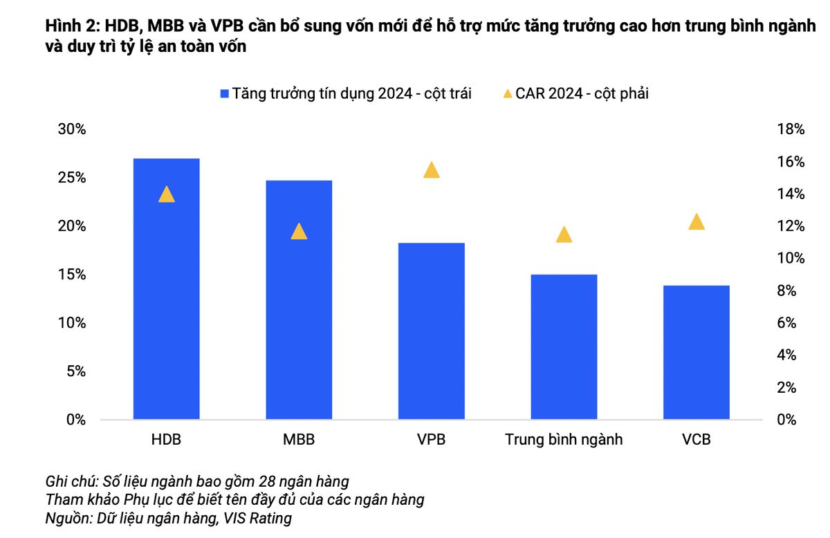 “Chúng tôi ước tính tỷ lệ an toàn vốn (CAR) có thể giảm từ 150 đến 300 điểm cơ bản đến cuối năm 2026 nếu các ngân hàng trên không tăng vốn cổ phần mới hoặc phát hành trái phiếu tăng vốn cấp 2. Từ trước đến nay, các ngân hàng chủ yếu dựa vào lợi nhuận giữ lại và phát hành trái phiếu tăng vốn cấp 2 để bổ sung nhu cầu vốn. Chúng tôi lưu ý rằng quá trình lựa chọn và đạt được thỏa thuận chính thức với nhà đầu tư nước ngoài thường kéo dài nhiều năm”, các chuyên gia của VIS Rating nhận định.