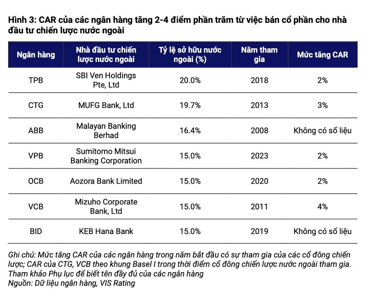 Được biết, tỷ lệ sở hữu nước ngoài của VCB sẽ duy trì ở 30%. Ngân hàng có kế hoạch chào bán 6,5% vốn cổ phần trong năm 2025-2026 cho nhà đầu tư nước ngoài, trong đó có đối tác chiến lược, Ngân hàng Mizuho. Nếu thành công, VIS Rating ước tính tỷ lệ CAR của VCB sẽ tăng hơn 200 điểm cơ bản từ mức hiện tại. Về dài hạn, sự tham gia của nhà đầu tư chiến lược nước ngoài sẽ giúp tăng cường bộ đệm hấp thụ rủi ro của các ngân hàng thông qua việc bơm vốn mới và hỗ trợ chiến lược tăng trưởng kinh doanh, quản trị rủi ro cũng như tăng khả năng tiếp cận nguồn vốn quốc tế.