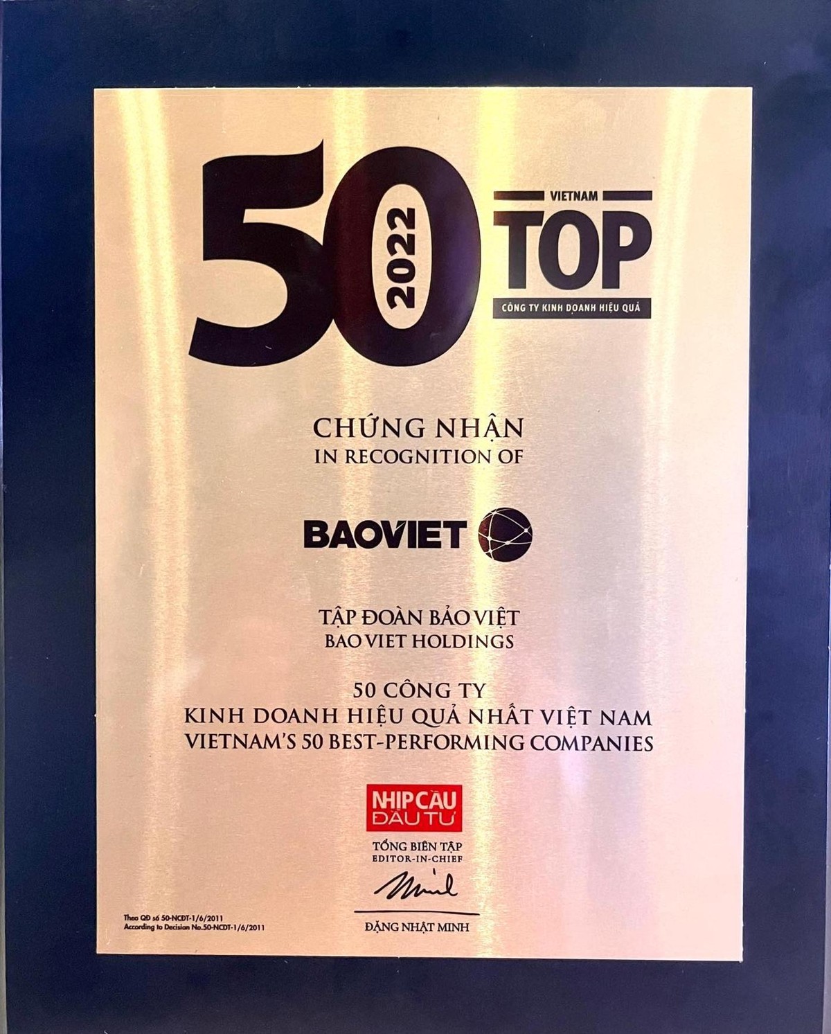 Trong khuôn khổ Hội nghị đầu tư “Kinh tế Việt Nam – Ngôi sao sáng nhất”, đã diễn ra Lễ vinh danh “Top 50 công ty niêm yết kinh doanh hiệu quả nhất Việt Nam năm 2022”. Tại Lễ vinh danh, Tập đoàn Bảo Việt là doanh nghiệp Việt dẫn đầu ngành bảo hiểm trong Top 50 Công ty niêm yết kinh doanh hiệu quả nhất Việt Nam năm 2022. Đây là năm thứ 6 liên tiếp, Tập đoàn Bảo Việt có mặt trong danh sách này dù thị trường tài chính - bảo hiểm có sự cạnh tranh mạnh mẽ.