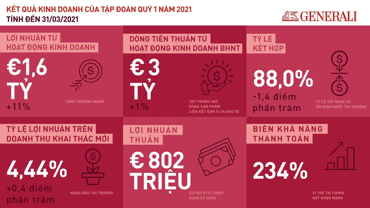 Dòng tiền thuần từ hoạt động kinh doanh bảo hiểm nhân thọ lên tới 3 tỷ Euro (tăng 1%), tập trung ở dòng sản phẩm liên kết đơn vị và bảo vệ. Tỷ lệ kết hợp đạt 88% (giảm 1,4 điểm phần trăm) và tỷ lệ lợi nhuận trên doanh thu khai thác mới cũng ghi nhận kết quả ấn tượng, hàng đầu thị trường với 4,44% (tăng 0,4 điểm phần trăm). Lợi nhuận thuần lên tới 802 triệu Euro (so với 113 triệu Euro của cùng kỳ năm ngoái).