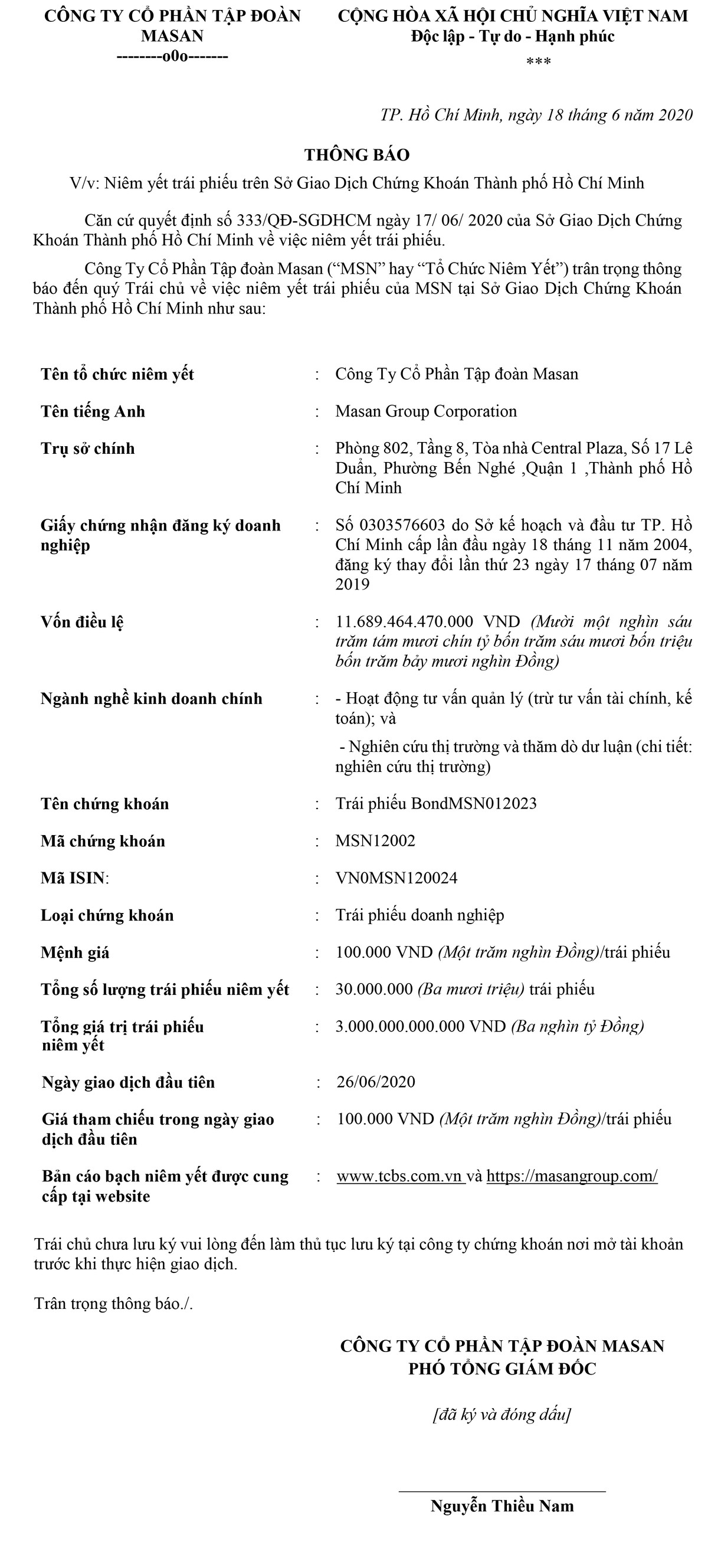 Tập đoàn Masan thông báo niêm yết trái phiếu trên Sở GDCK TP.HCM