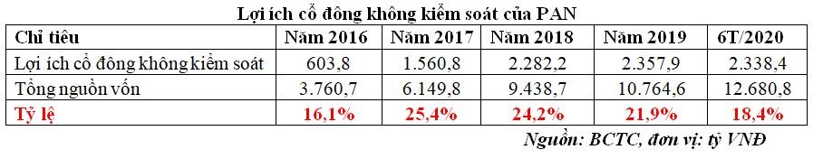 Điểm đáng lưu ý trên báo cáo của PAN là khoản mục lợi ích cổ đông không kiểm soát liên tục gia tăng trong nhiều năm trở lại đây, khoản mục này xuất hiện khi doanh nghiệp liên tục thực hiện hợp nhất các các công ty con vào báo cáo, trong đó tương ứng với tỷ lệ mà doanh nghiệp chưa sở hữu hết.
