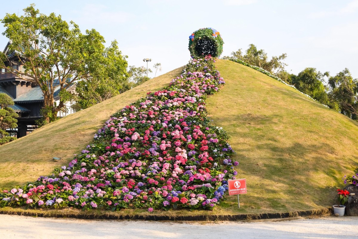 Khu vực Đồi Mặt Trời tràn ngập sắc xuân với hàng nghìn bông cẩm tú cầu đủ kích thước và sắc màu được thiết kế như một thác hoa khổng lồ. Đây là điểm điểm dừng chân lý tưởng được du khách lựa chọn để check in, chụp ảnh lưu lại những khoảnh khắc đầu năm mới.