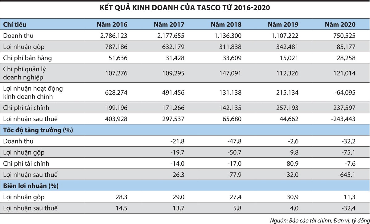 Kể từ năm 2017 tới nay, Tasco có tình hình kinh doanh thụt lùi khi doanh thu và lợi nhuận có xu hướng giảm. Trung bình trong 4 năm trở lại đây, doanh thu giảm 26,1%/năm và năm 2020, Công ty lỗ 243,4 tỷ đồng.