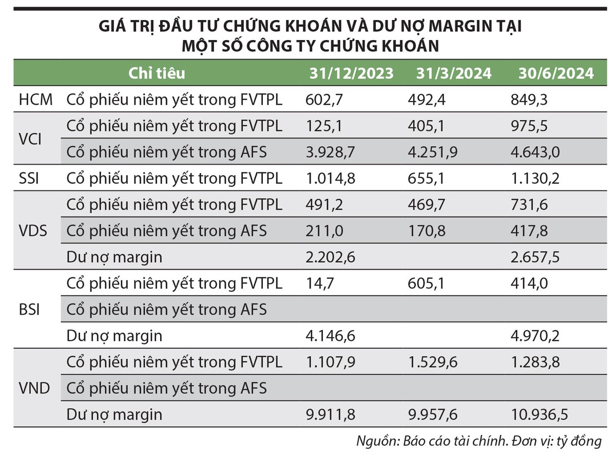 Tương tự, Công ty Chứng khoán BIDV (mã BSI) tăng tài sản FVTPL trong quý I/2024 từ 14,7 tỷ đồng lên 605 tỷ đồng, nhưng đến cuối quý II/2024 giảm xuống 414 tỷ đồng. Trong đó, từ 4 khoản đầu tư lớn vào cổ phiếu FPT (49,7 tỷ đồng), TCB (48,1 tỷ đồng), HPG (49,9 tỷ đồng), MWG (56 tỷ đồng) trong quý I, thì tính tới cuối quý II chỉ còn hai khoản đầu tư lớn là TCB (46,3 tỷ đồng) và HPG (49,9 tỷ đồng), đồng thời giảm 83,7 tỷ đồng đầu tư vào các cổ phiếu khác.