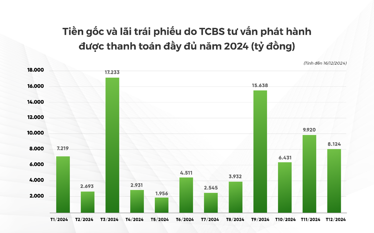 Lũy kế từ đầu năm 2024 đến 16/12/2024, khoảng 83.134 tỷ đồng tiền gốc và lãi của các trái phiếu đến hạn do TCBS tư vấn phát hành đã được thanh toán đầy đủ, trong đó, lô trái phiếu 6.575 tỷ đồng của SDI Corp vừa được thanh toán đúng hạn vào ngày 16/12 vừa qua. Theo kế hoạch, cuối tháng 12, lô trái phiếu 6.500 tỷ đồng của một doanh nghiệp lớn cũng sẽ được hoàn tất thanh toán.