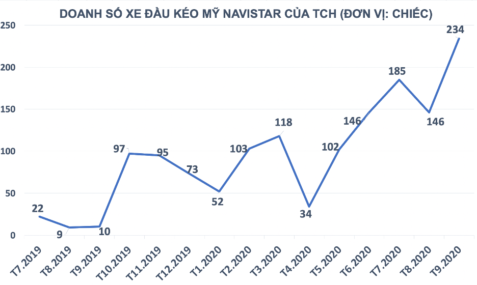 Ở mảng xe thương mại, doanh số xe đầu kéo Navsitar (Mỹ) của TCH cũng đang có đà tăng trưởng vững chắc và vượt trội. Cụ thể, tháng 9 vừa qua, doanh số xe đạt 234 chiếc, tăng mạnh so với các tháng trước.