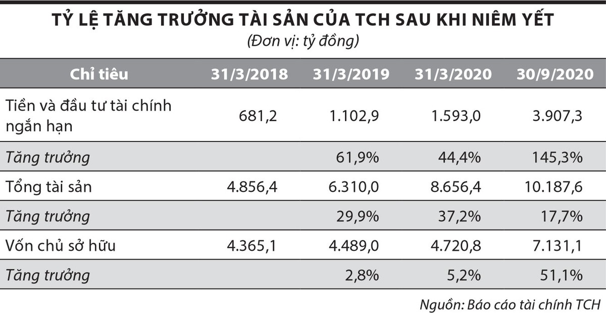 Kể từ 31/3/2018, TCH duy trì được tốc độ tăng trưởng tài sản 28,3%/năm. Tiềm lực tài chính là lợi thế để Công ty triển khai các dự án bất động sản, tiếp tục tăng trưởng mạnh trong những năm tới.