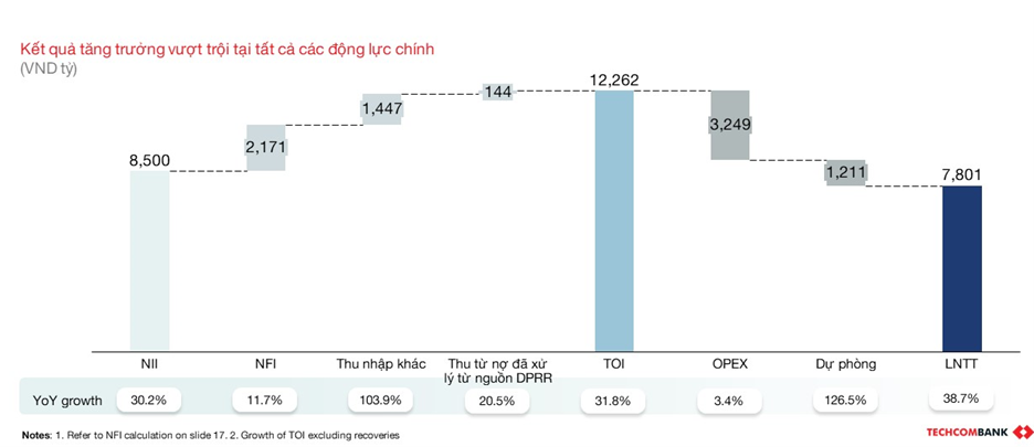 Tiếp nối đà tăng trưởng từ cuối 2023, Techcombank ghi nhận kết quả tích cực tại quý đầu năm 2024. Tổng thu nhập hoạt động (TOI) và lợi nhuận trước thuế lần lượt tăng 32% và 39% so với cùng kỳ năm trước, dẫn dắt bởi thu nhập lãi, phí và các hoạt động khác tăng trưởng ấn tượng, đồng thời duy trì quản trị chi phí chặt chẽ.