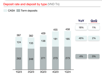 Tiền gửi khách hàng của Techcombank tăng trưởng ấn tượng 18,3% so với cùng kỳ và ổn định so với đầu năm, đạt 458 nghìn tỷ đồng. Trong đó tiền gửi không kỳ hạn (CASA) tăng 49,4% so với cùng kỳ và 2% so với cuối năm 2023, giúp tỷ lệ tiền gửi không kỳ hạn trong tổng tiền gửi tăng lên mức 40,5%, mức cao nhất hệ thống ngân hàng.